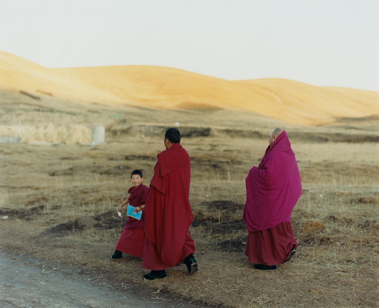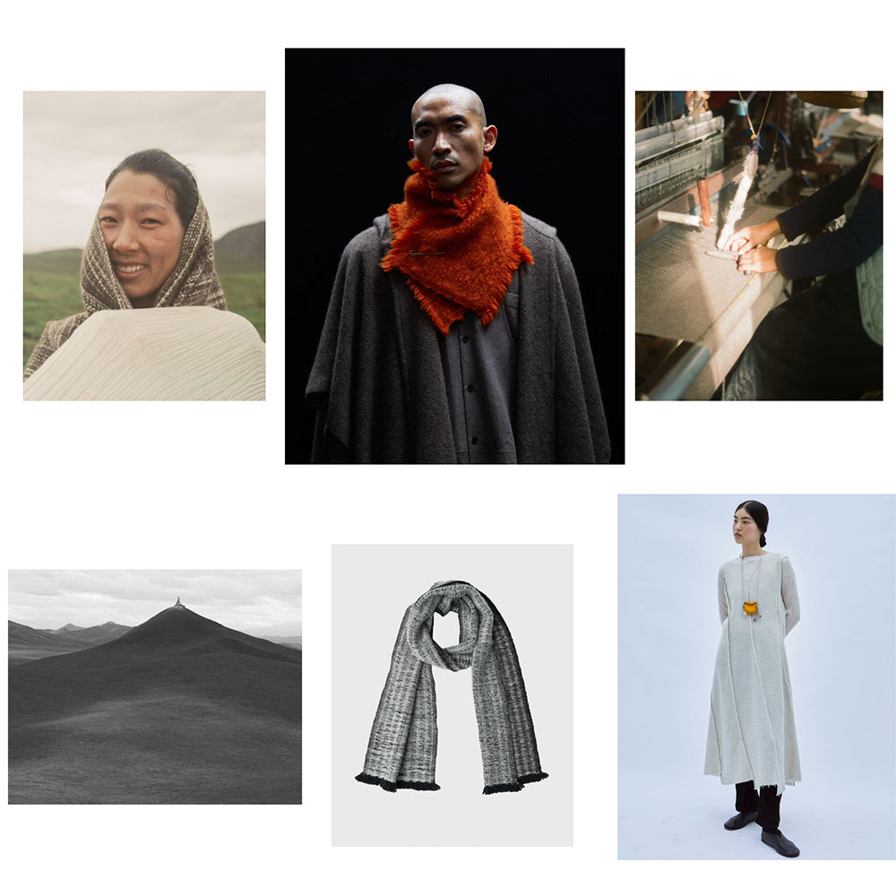 The balance of colours in Norlha’s AW23 collections subtly references this fruitful coexistence. The RTW collection’s tonal browns, greys and greens reflect the muted shades of the pastures, while the highly pigmented yellows, pinks, oranges, blues and reds of the scarves and accessories nod towards the human presence on the plateau, in particular, the monks’ deep burgundy robes and the brightly coloured prayer flags that adorn monasteries and mountain peaks.