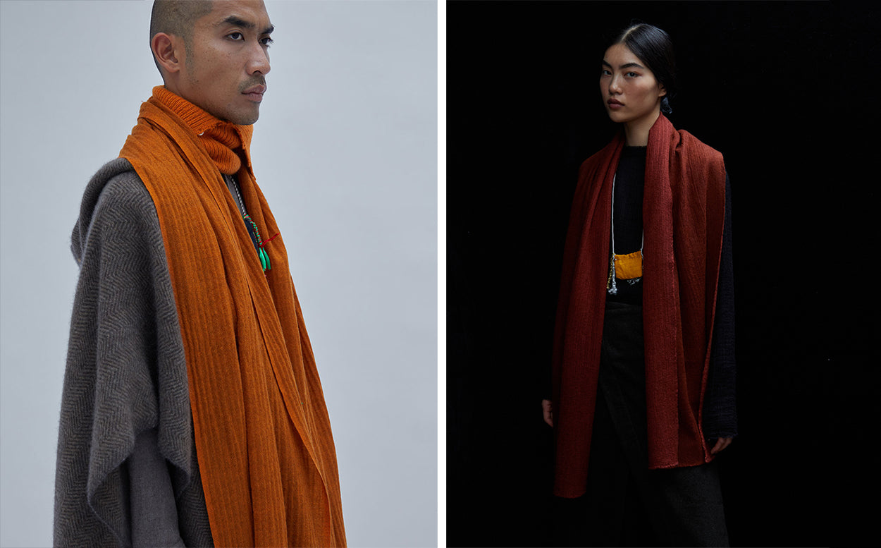 A particular focus of Norlha’s collection of scarves for this season is over-felting – a technique perfected by Norlha’s artisans, wherein a base woven fabric is felted with pure khullu. This hand-finished process adds warmth and density to the weave while creating a double-faced effect through textural and tonal variance in the finished fabric.
