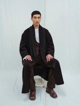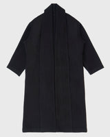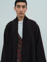 This heavyweight open-front coat envelopes the body in softness and warmth with an oversized, floor-length silhouette. It features a draped shawl collar, pockets at the side seams, raw-edged cuffs, and hand-finished details throughout. The finished fabric is boiled for added density and a fleece-like touch. With generous sleeves and an open front, it is ideal for winter layering.