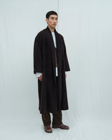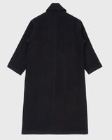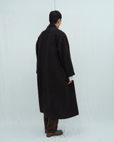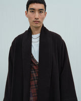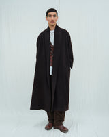 This heavyweight open-front coat envelopes the body in softness and warmth with an oversized, floor-length silhouette. It features a draped shawl collar, pockets at the side seams, raw-edged cuffs, and hand-finished details throughout. The finished fabric is boiled for added density and a fleece-like touch. With generous sleeves and an open front, it is ideal for winter layering.