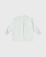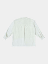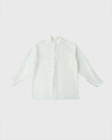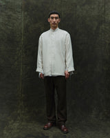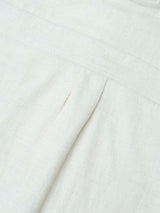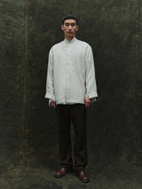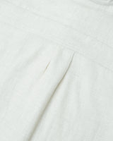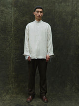 A comfortable, easy-wearing shirt in a natural white khullu and silk blend. Its details include asymmetrical buttons and patching, split side seams, a double back yoke twin stitched for strength, and an oversized welt pocket on the chest.