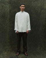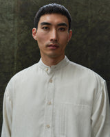 A comfortable, easy-wearing shirt in a natural white khullu and silk blend. Its details include asymmetrical buttons and patching, split side seams, a double back yoke twin stitched for strength, and an oversized welt pocket on the chest.