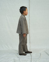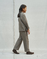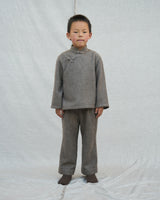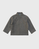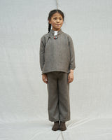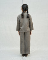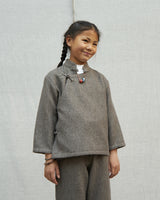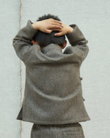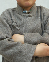 This classic shirt is woven in a classic twill, using shepherd natural brown wool in the warp and natural yak white in the weft. Made in a lightweight yak khullu and sheep’s wool blend, featuring a traditional mandarin collar, hand knotted toggle closures, and loose kimono sleeves.
