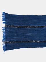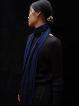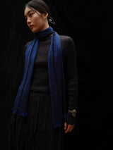 This lightweight scarf is made from a yak khullu and silk blend. The balance between the scarf’s fibres gives it a naturally crinkled texture. It features two vertical lines of exposed khullu in the weft, created by leaving a blank space in the silk warp while weaving.