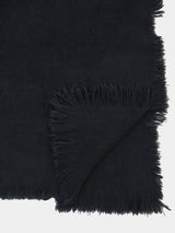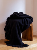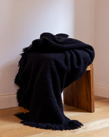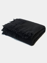 This heavy-weight blanket is woven from 100% yak khullu by one artisan on a four-pedal loom. Its fringe is cut to varying lengths on all four sides. The finished fabric is boiled for added density and softness.