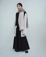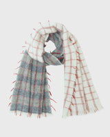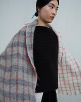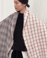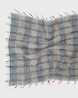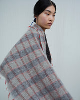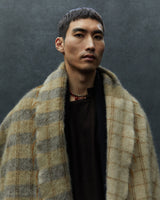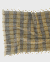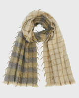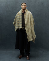 An intensely soft 100% yak khullu scarf. The finished fabric is boiled for added density and a fleece-like touch. It features a subtle, checked design and a delicate fringing along its four sides.