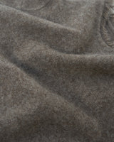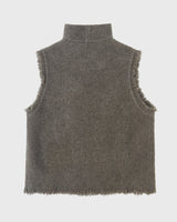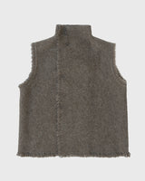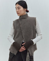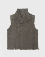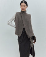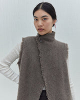This vest is made from pure yak khullu that has been lightly boiled for a dense, fleece-like touch. Its loose weave gives weightlessness and warmth. It can be fixed at the collar with a brass safety pin (included) or worn with an open lapel and fixed at the chest. It is finished with raw fringing at the shoulders, down the torso and along the hemline.