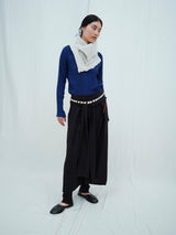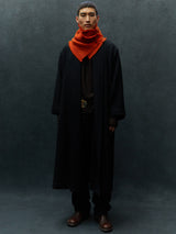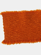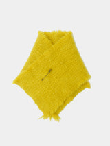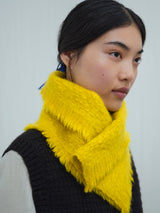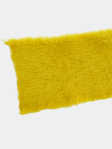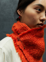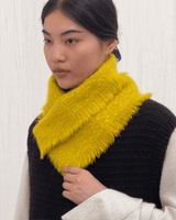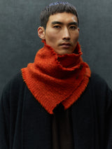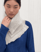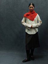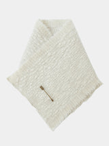 This neck warmer is made from pure yak khullu in a thick, warm weave. The finished fabric is boiled for added density and a fleece-like touch. It can be worn knotted snugly around the neck or pinned for a looser fit. The pin is included with the piece.