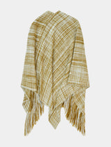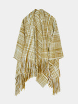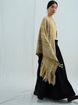 This midweight open-front cape has an oversized silhouette and drapes over the body with a fluid form. Its thread is masterfully handspun, ensuring the finest and softest yak khullu thread possible. The fabric’s handwoven loose weave is both exceptionally breathable and warm. The cape is made from two square panels that taper to an elegant V-shape at the back. It is finished with fine, long fringing along its two front edges.