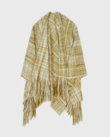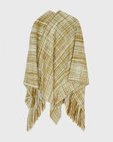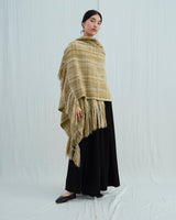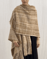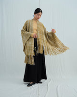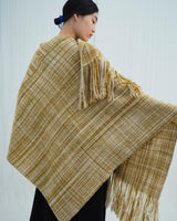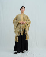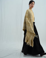 This midweight open-front cape has an oversized silhouette and drapes over the body with a fluid form. Its thread is masterfully handspun, ensuring the finest and softest yak khullu thread possible. The fabric’s handwoven loose weave is both exceptionally breathable and warm. The cape is made from two square panels that taper to an elegant V-shape at the back. It is finished with fine, long fringing along its two front edges.