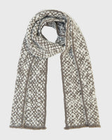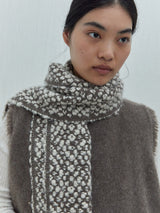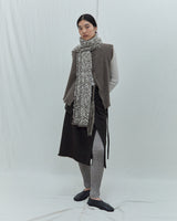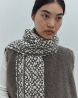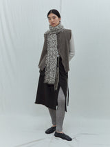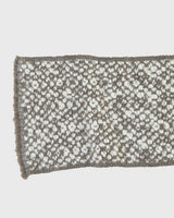 This narrow scarf is made from two undyed shades of yak khullu and combines machine-spun and handspun yarns. Its warp is natural grey khullu and its weft is handspun natural white khullu, which creates a softly textured effect across the scarf’s surface.