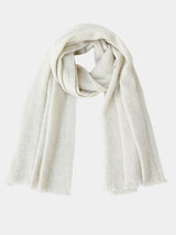 This scarf’s naturally white fibre base is entirely unbleached. White yak khullu is exceptionally rare, with only one in every thousand animals possessing an albino coat.