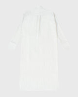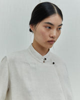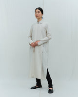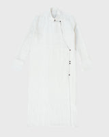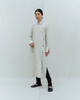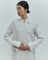 This wrap shirt dress is made from an incredibly light and softly textured yak khullu and silk blend. Long and loose with an asymmetrical cut, it features set-in sleeves with oversized cuffs that split at the hand. Its collar references traditional Tibetan tailoring and features a quilted fold at the chest. Miniature contrast horn buttons run from the neck down the side and are fastened with knotted yarn loops.