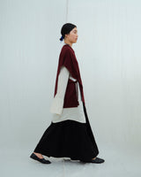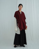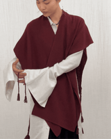 This open-front cape is made from a yak khullu and silk blend in a compact, lightweight weave. It sits at the hips and features four ties at the front and two ties at the back, allowing it to be styled in a variety of ways.