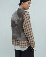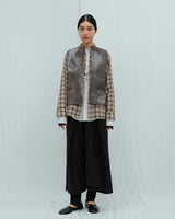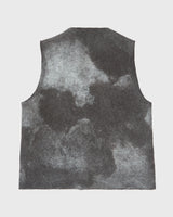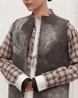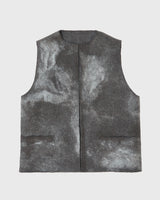 This vest is raw-felted and moulded using a zero-waste process, demonstrating remarkable craftsmanship and skill. With a seamless construction, it features seamless pockets and a high neck. The irregular melange design combines white and natural grey khullu, the vest’s cloud-like patterns varying from piece to piece, adding to their unique quality.