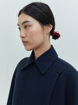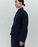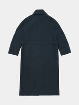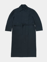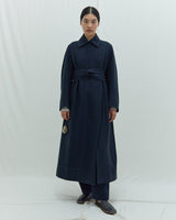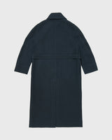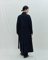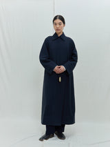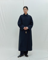 A generously cut, full-length coat in exceptionally warm 85 % Yak Khullu,15% Silk. Its double-button chest fastening references traditional Tibetan tailoring. It can be worn open and unbuttoned, or tied with the ample waist belt wrapped twice around the body through the twin belt loops. Its centre-back split and wide-cut sleeves allow for comfort and mobility, while its high-cut, tabbed collar and cross-body lapel offer a protective encasement from the elements.