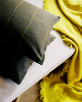 This cushion cover is made from a delicately textured yak khullu and silk-blend woven fabric that has been over-felted with pure yak khullu to give extra warmth and density. Its design features a narrow, raised rib of coloured fibre along its length.