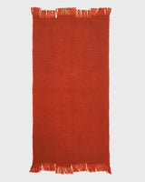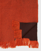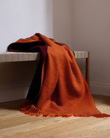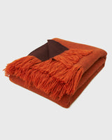 This 100% yak khullu throw has a unique double-faced design. It features a bright orange woven side, which has been over-felted with additional khullu in deep burgundy for extra density and warmth. It also features an irregular stepped edge on two sides, which is enhanced by long, raw fringing.
