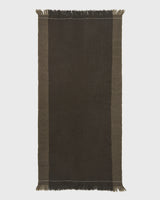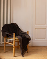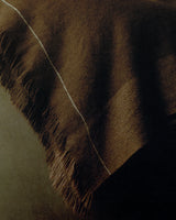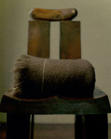 This throw is woven from undyed yak khullu and is boiled for added density and softness. With a natural brown base, its lighter-toned vertical borders are created by introducing natural golden brown khullu into the warp. It features a stitched line of warm white khullu thread on each fringed edge.
