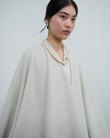 This pure yak down open-front cape is refined and luxurious with a cropped cut for versatile, easy wear. It features a structural welt seam lining the back of the shoulders and arms and a hand-stitched welt turnover at the hem.