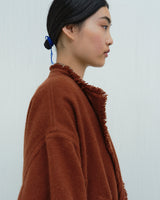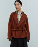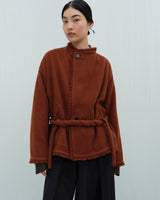 This dense boiled cropped jacket is inspired by traditional Tibetan outerwear. Incredibly warm in 100% yak khullu, the jacket features a twisted low waist cord tie, dropped sleeves and fringed welt pockets. It securely fastens across the chest and waist with large horn buttons.