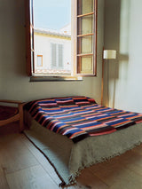 This hand-felted bed cover is made from 100% yak khullu using a zero-waste process. It is dense and warm with a smooth, compact feel. Its design is inspired by the colourful striped aprons (pangden) worn by women across central Tibet.