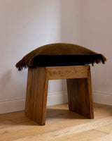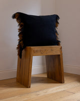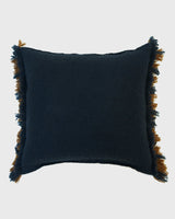 This cushion cover is made from two panels of woven khullu, which are hand-stitched together. The slight differences between the weaves give the seam a subtly rippled effect. The finished fabric is boiled for added density and a fleece-like touch. The cushion raw fringing is cut unevenly to create a tasselled effect.