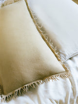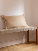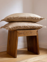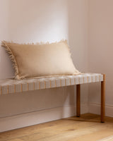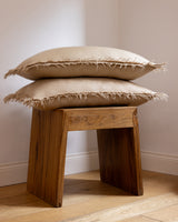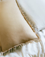 This cushion cover is made from a yak khullu and silk-blend that has been over-felted with additional khullu for extra density and durability. The cover’s surface is felted, while its woven side is concealed. It is finished with a visible seam and raw fringing on all four sides.