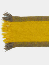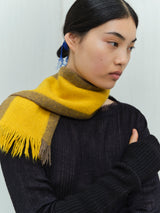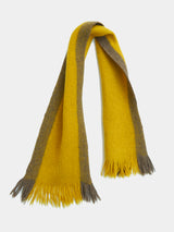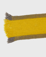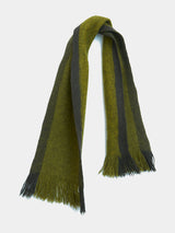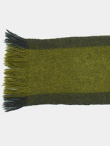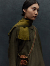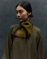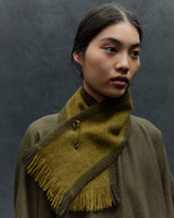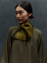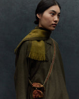 This neck warmer is made from a woven yak khullu base, which is finished with a hand-felted layer of additional khullu for extra warmth and density. It features vertical borders in a deep green tone that contrast with its lighter green base. It can be worn knotted snugly around the neck or pinned for a looser fit.