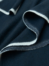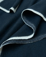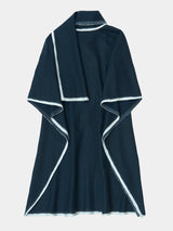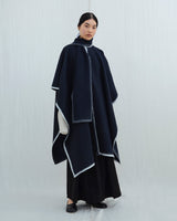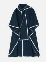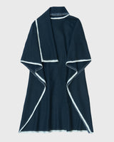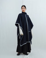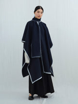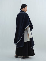 This lightweight cape has an silhouette and drapes over the body with a fluid form. It features an oversized panel at the neck that, can be worn like a scarf or left to hang loosely. The cape can be joined at both sides with a button to create generous, roomy sleeves. It is finished with a contrast hem made from pure white yak khullu. This fabric is made using an overfelting technique developed at Norlha Atelier, in which yak khullu is felted onto a woven yak wool textile, creating a subtle, double-faced finish.