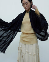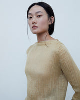This top is woven from fine yak khullu and silk, which, when blended, create a crinkled texture in the weave. It has a flattering boat neck, an oversized length that falls below the hips, and long sleeves that flow over the wrists. Its casual, straight fit flows easily over the body, with its natural crinkles expanding and contracting with movement. It is finished with raw edges and hand-stitched details at the neckline.
